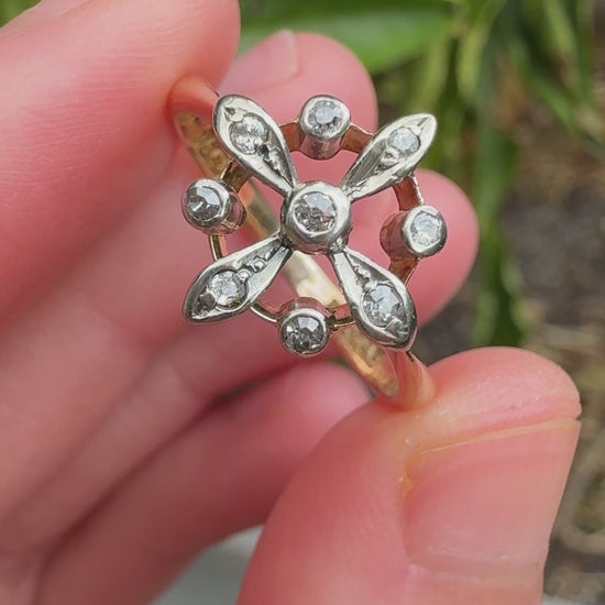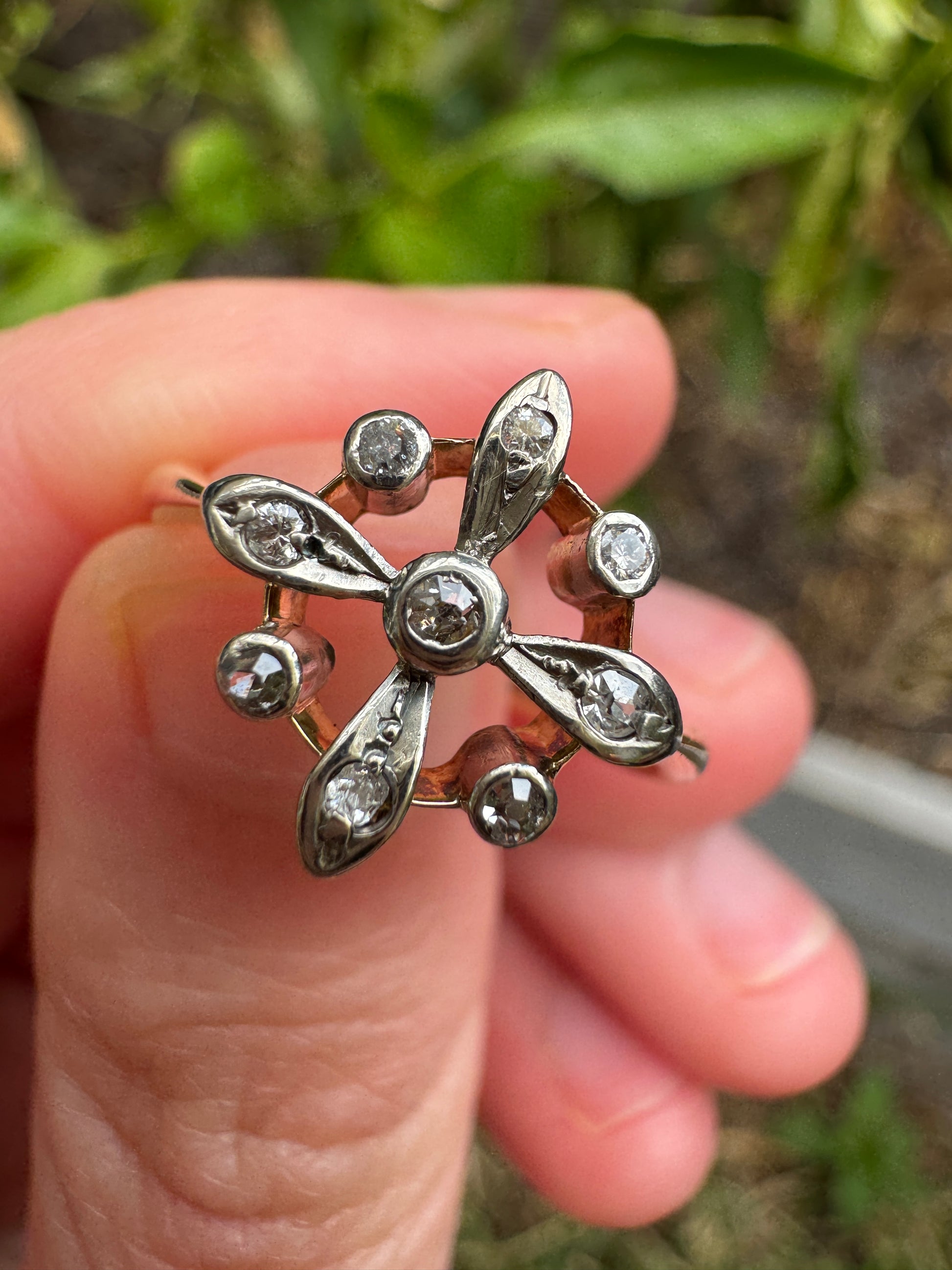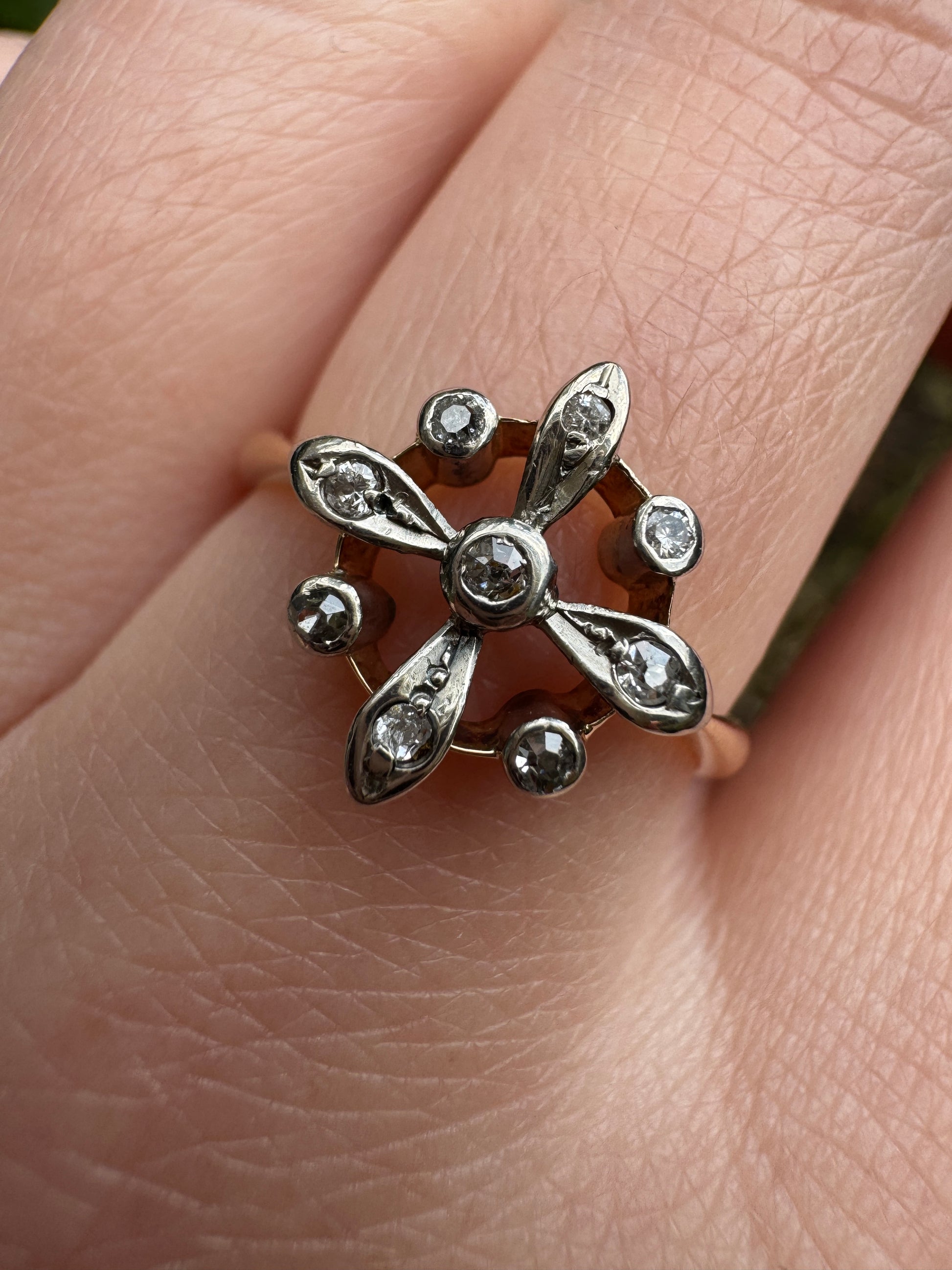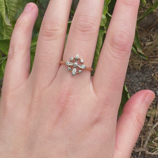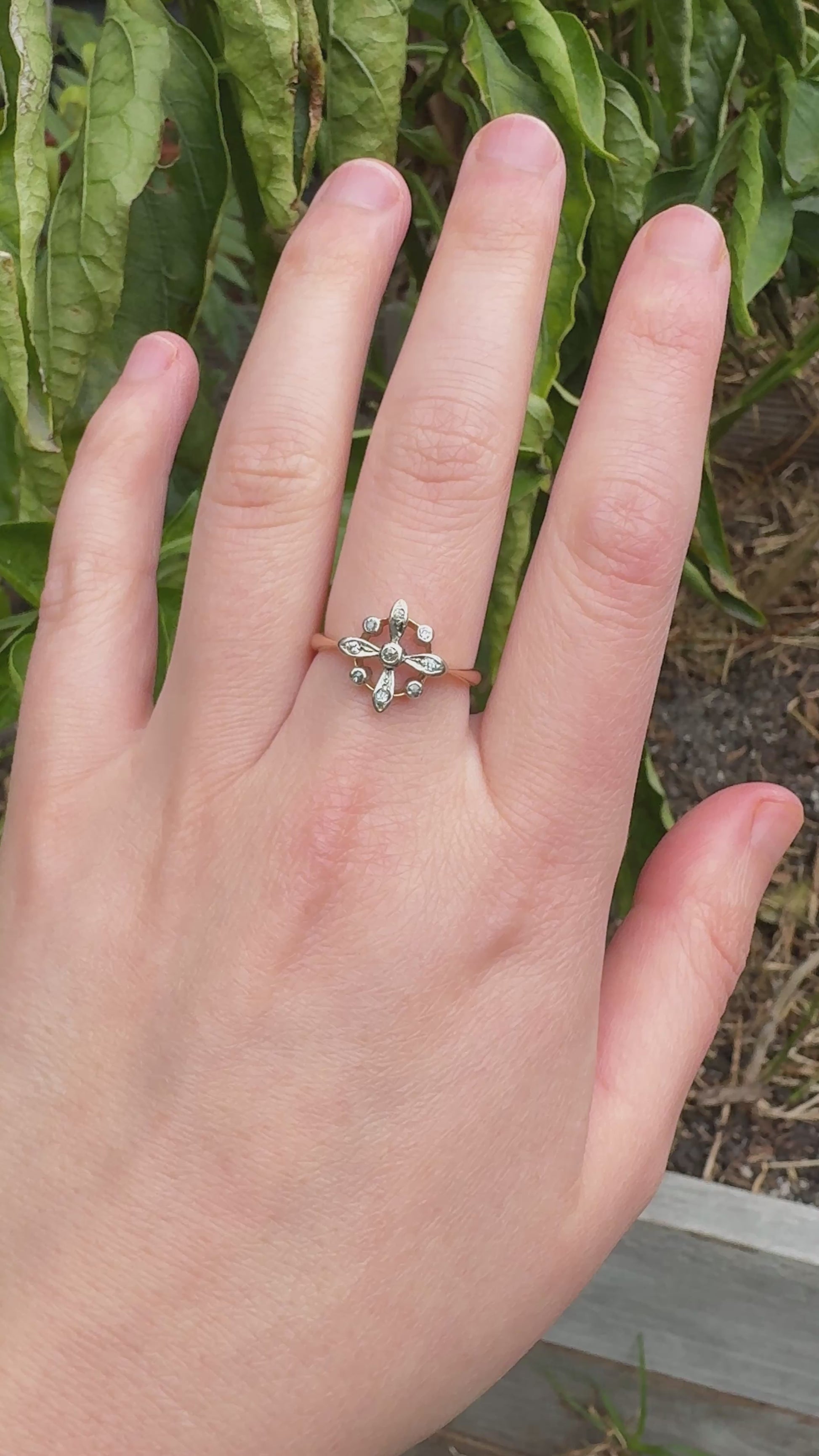A ring unlike any other - this rare antique piece combines 15ct gold, platinum and sweet old single cut diamonds (natural/earth mined, SI2-I2 clarity, G-H colour) in a striking design. The openwork setting forms a gorgeous floral motif, feeling light and airy on the hand while grabbing attention with its presence. This ring is both elegant and playful - a true antique treasure.