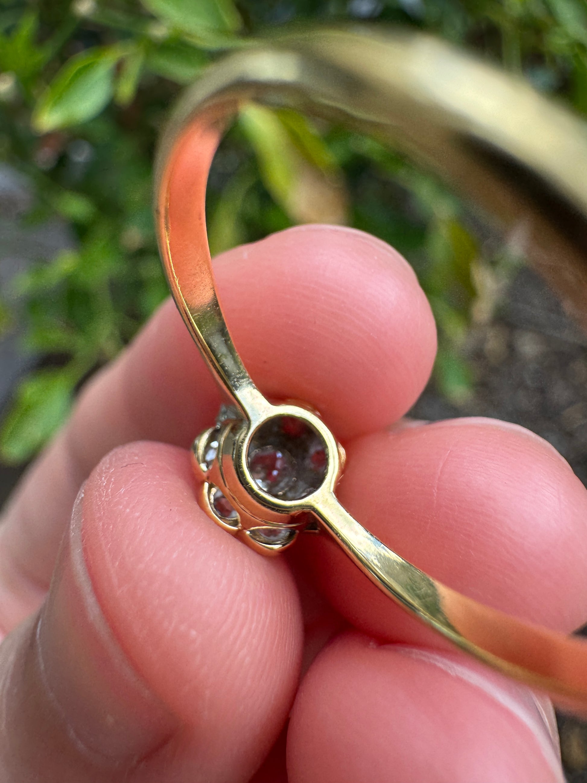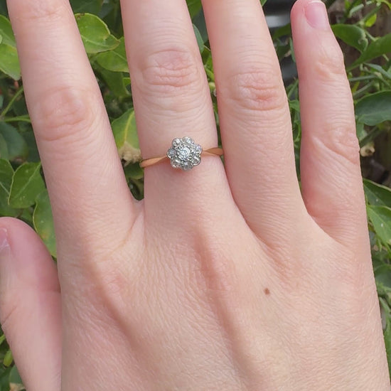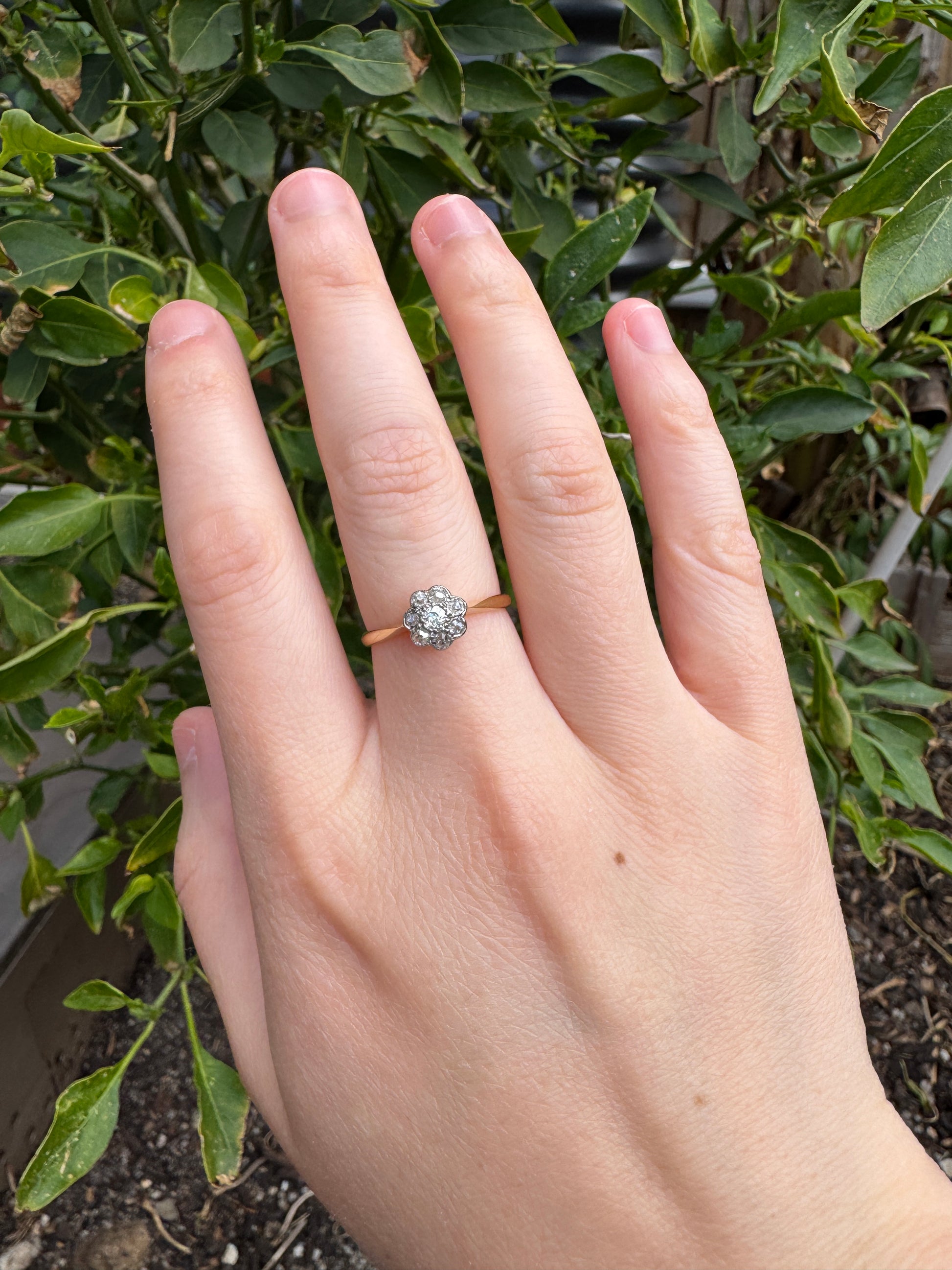 This antique diamond daisy cluster is just the sweetest piece - full of sparkle, charm and an irresistible glow! Set with 0.4ct total of old mine cut and single cut diamonds (natural/earth mined, SI1-I1 clarity, G-J colour), it looks gorgeous from every angle. We love this style for its timeless appeal. Each antique daisy ring is slightly different with its own character and personality, and this one is especially lovely with its soft, romantic sparkle. The perfect piece that will always make you smile, it's the kind of ring we're always thrilled to have in stock and one that never sticks around for too long.