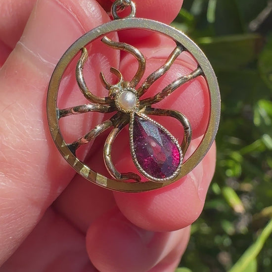 Antique 9ct yellow gold 0.6ct garnet and pearl spider pendant