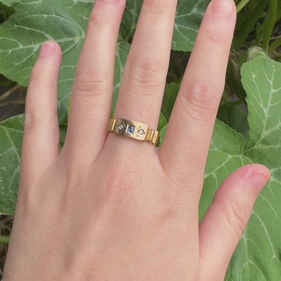 Made in rosy 15ct yellow gold, it has a lovely patina that only comes with a well-loved piece. The natural sapphire and old single cut diamonds are sweet, bright and full of life. What makes it even more exciting is the maker: this ring was made by Hiddlestone & Co of Victoria, Australia, whose mark is an anvil. We have never had a piece by this maker before - that alone makes it feel especially memorable.