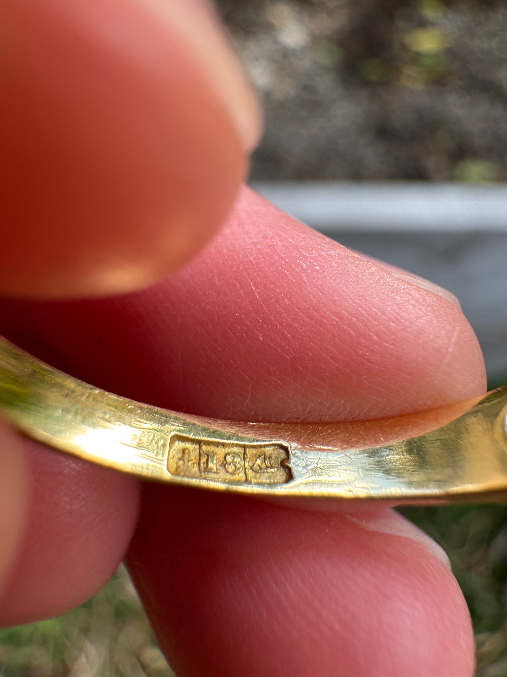 Condition: Stunning antique condition with beautiful details and stones. Small gold loss to back of stone setting (does not affect durability or wear) and light wear to band commensurate with age.
