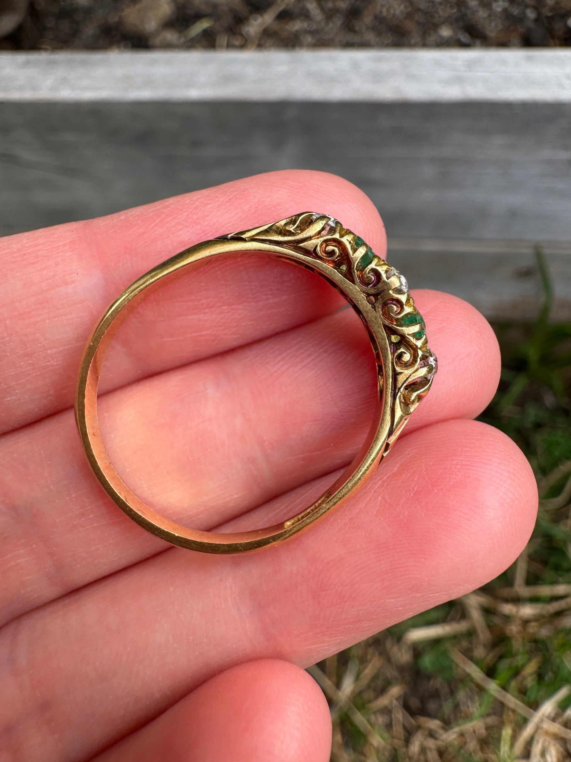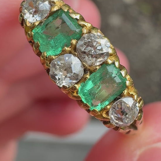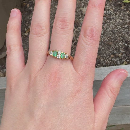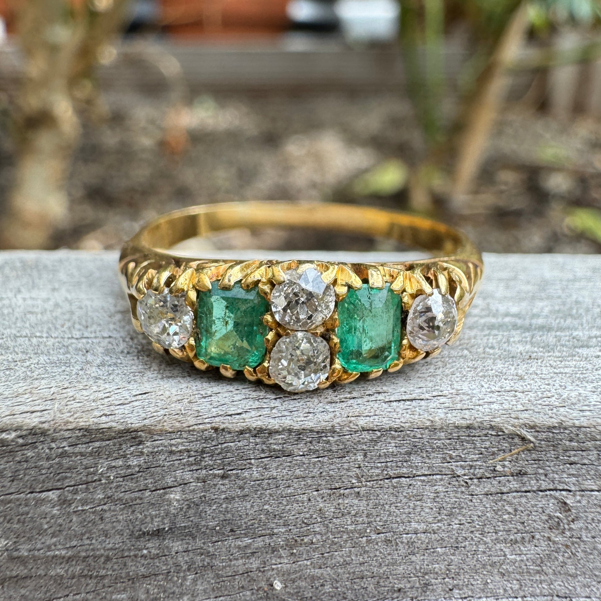 A true piece of Australian history, this antique 18ct gold ring is set with two vibrant natural emeralds and four sparkling old mine cut diamonds (natural/earth mined, I1-I2 clarity, G-H colour). The stones are in a beautifully detailed setting - we love the gorgeous craftsmanship in the undergallery too! This ring bears the mark of Duggin, Shappere & Co, a prolific Australian jeweller active in the late 19th and early 20th centuries. Attributable Aussie maker's marks are tricky to find, making this piece not only stunning but historically significant.