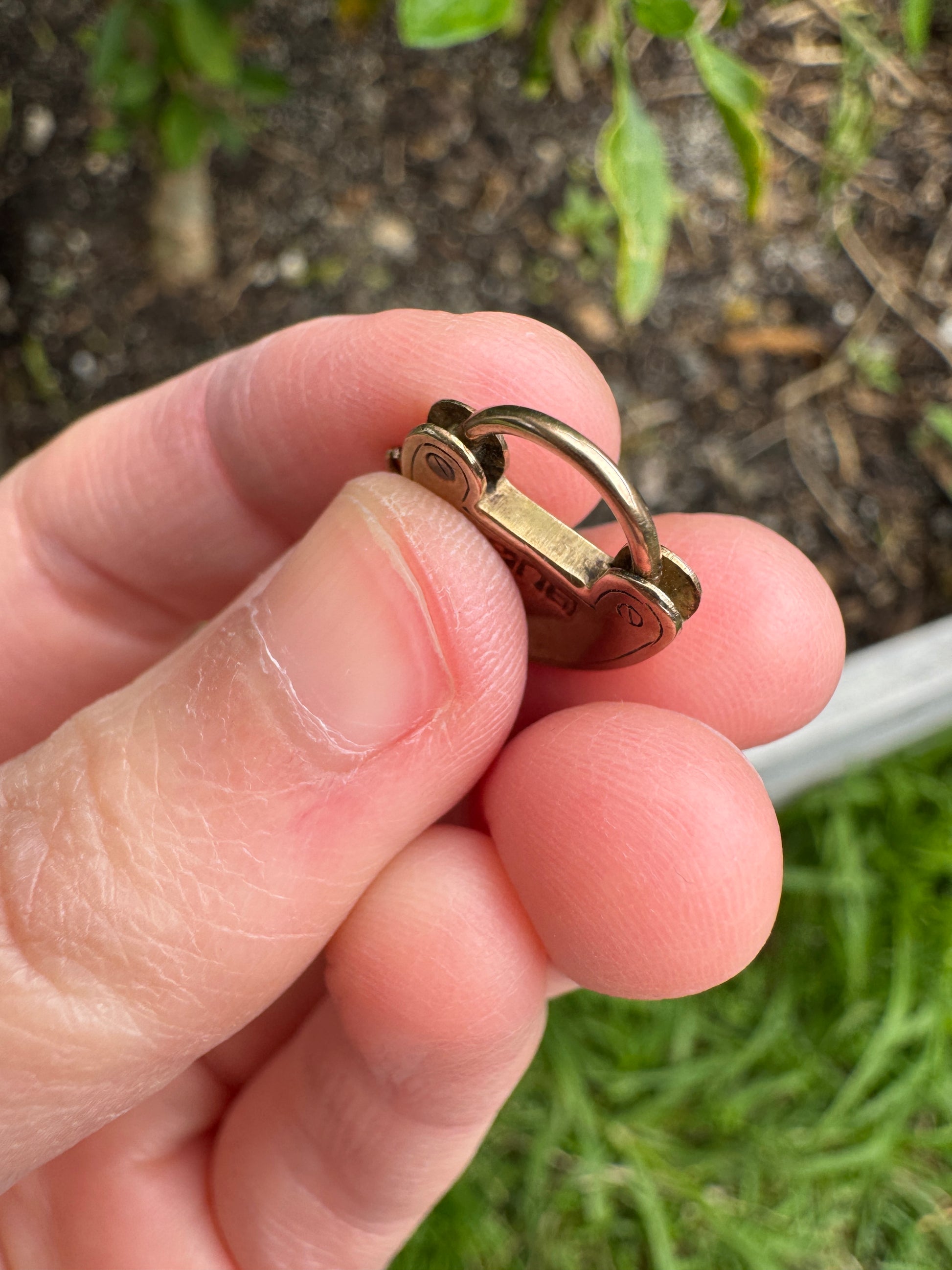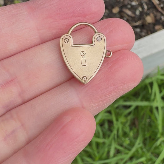 Made in Melbourne by Johnson & Simonsen (late 19th century/early 20th century), this little treasure is a beautiful example of local goldsmithing from a maker we haven't had a piece from before. The design is wonderfully unique - a padlock with hand-engraved screw details and a sweet keyhole motif on the front. It doesn't open or close, but instead slides effortlessly onto a chain or clips onto a dog clip, making it easy to wear as a pendant/charm. We love the playful, intentional personality in the engraving - it gives it a lovely point of difference to the usual padlocks in jewellery.