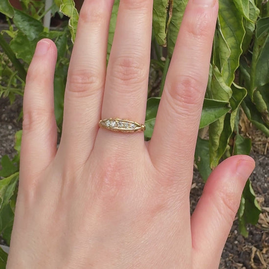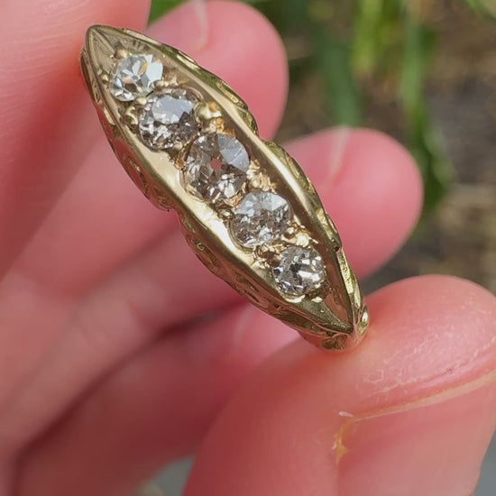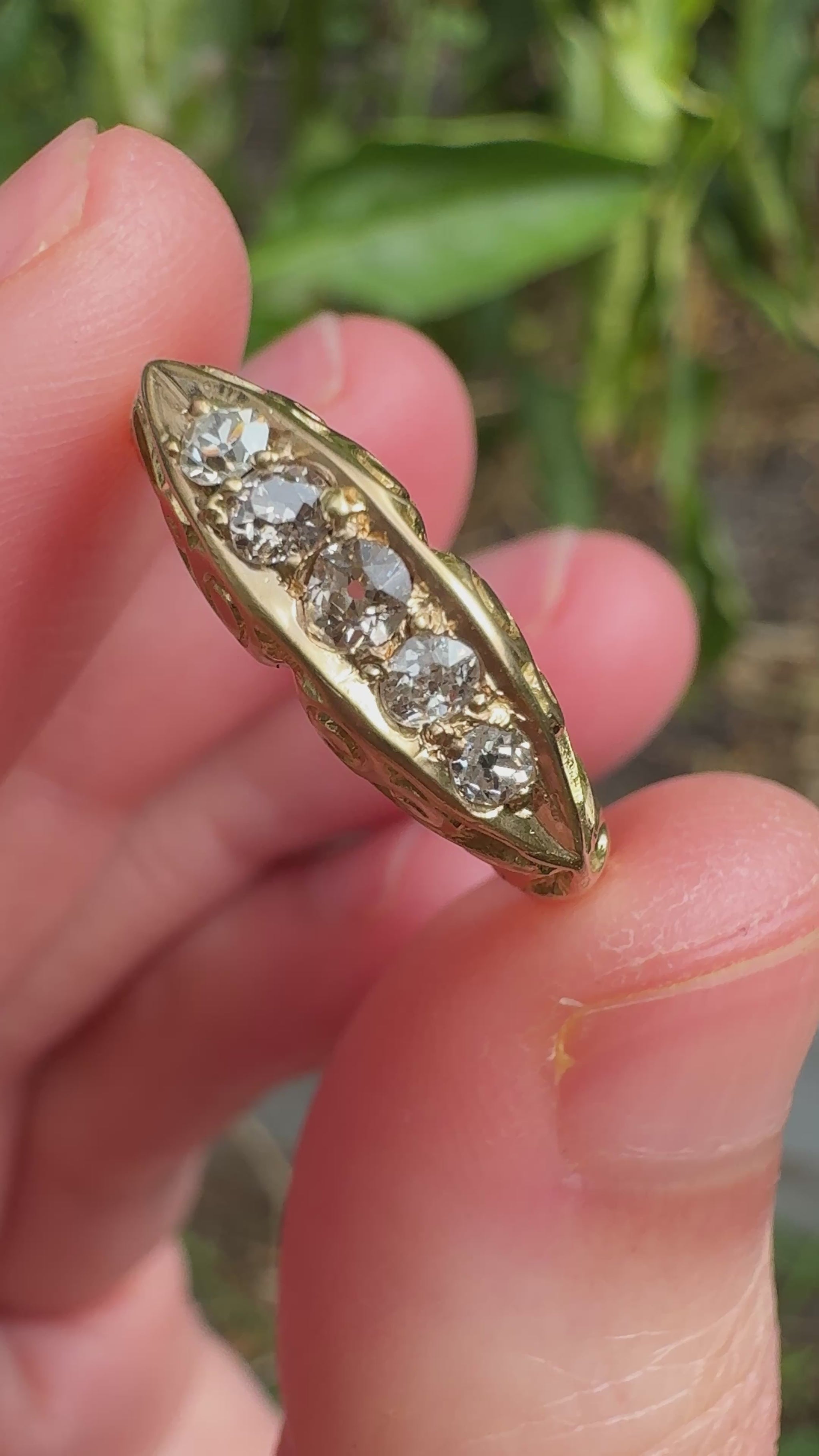 Antique English Edwardian 18ct yellow gold five stone 0.22ct TCW old mine cut diamond boat ring