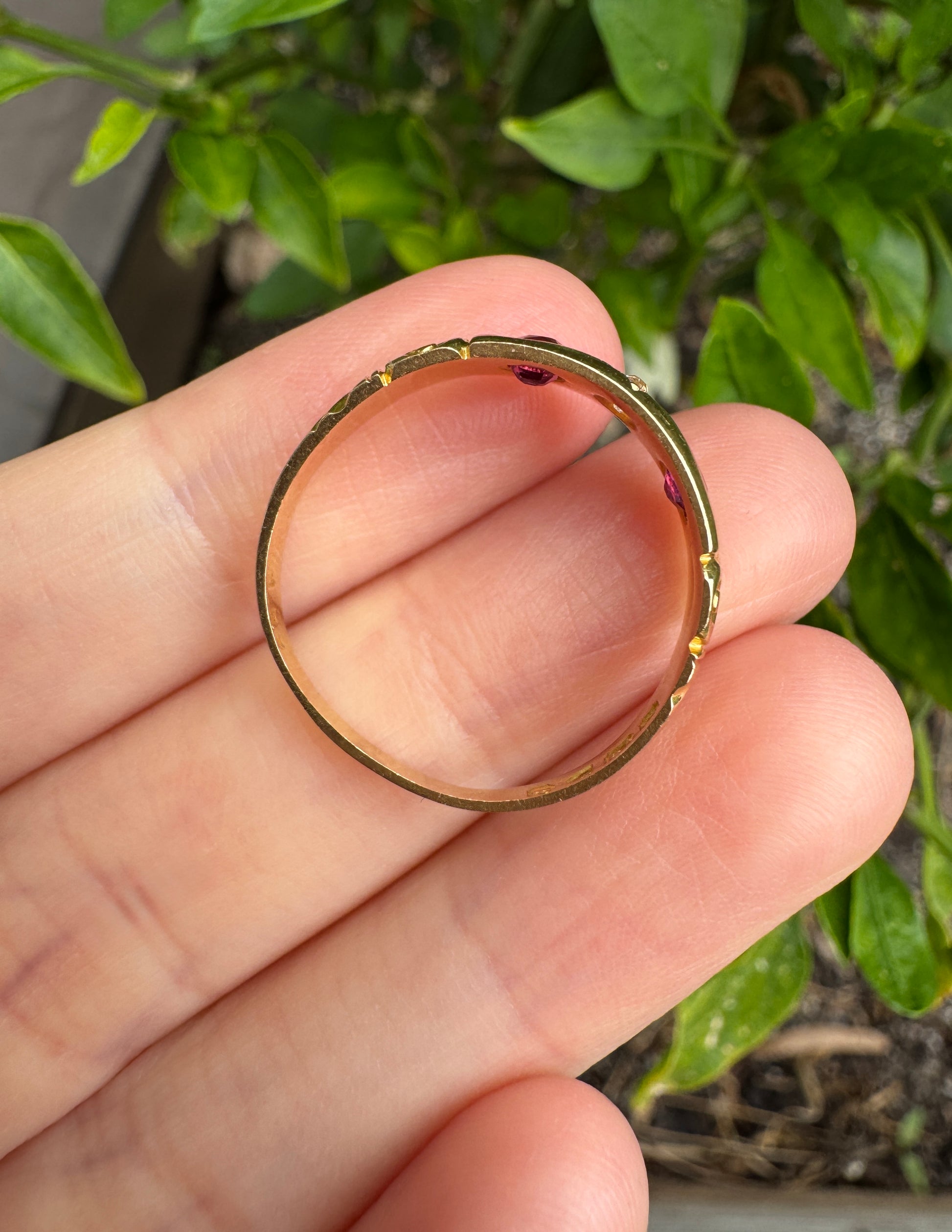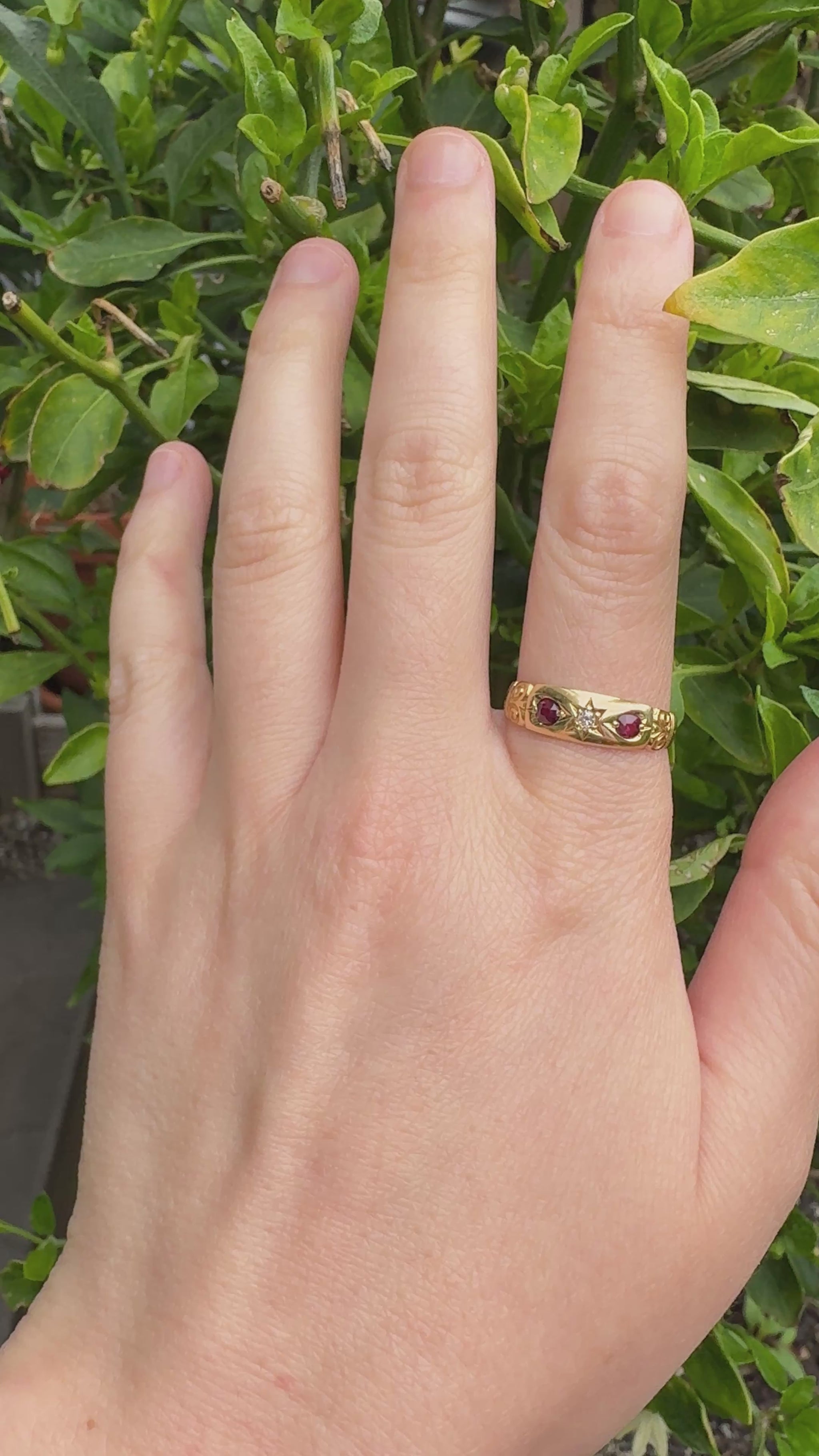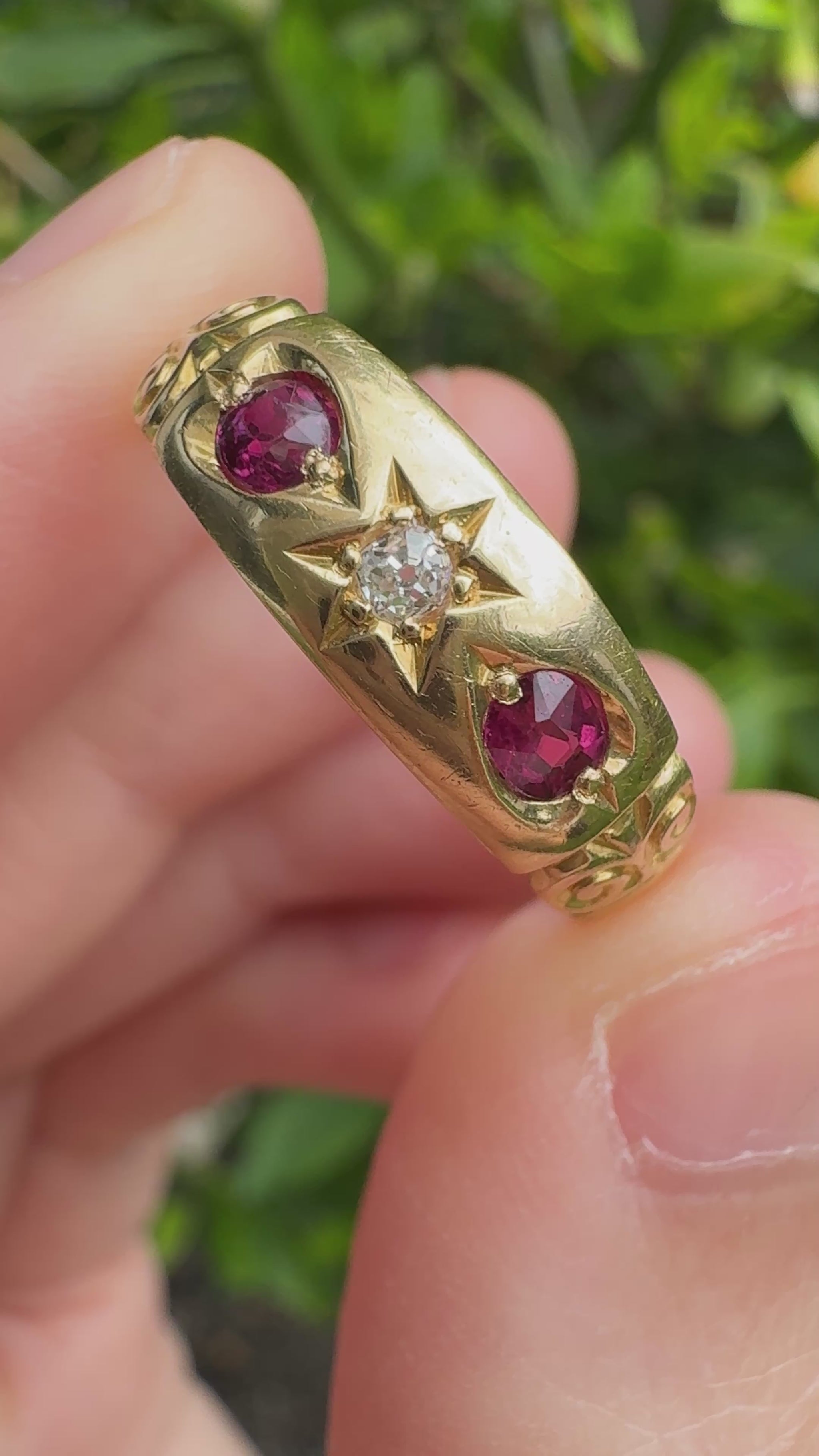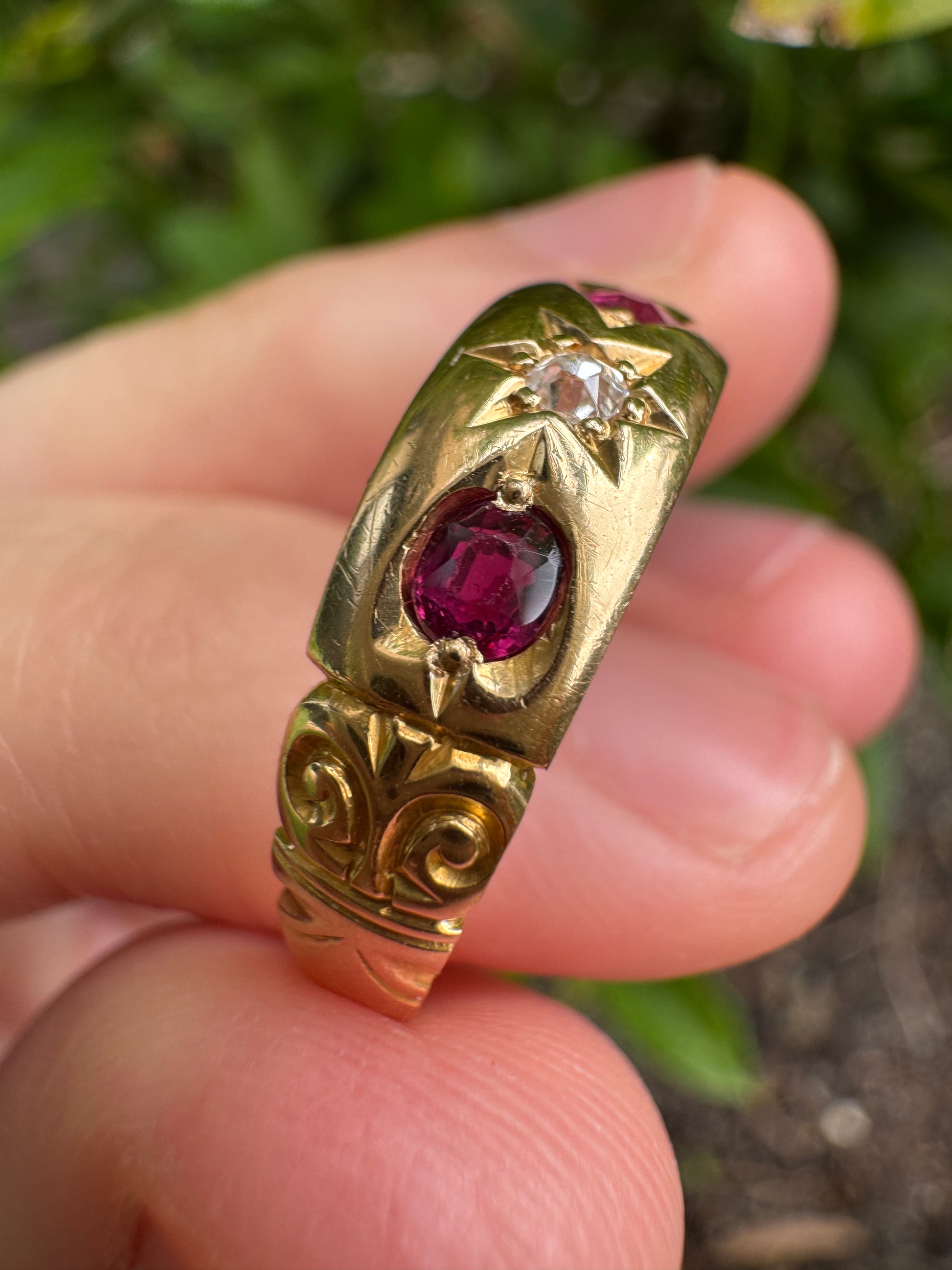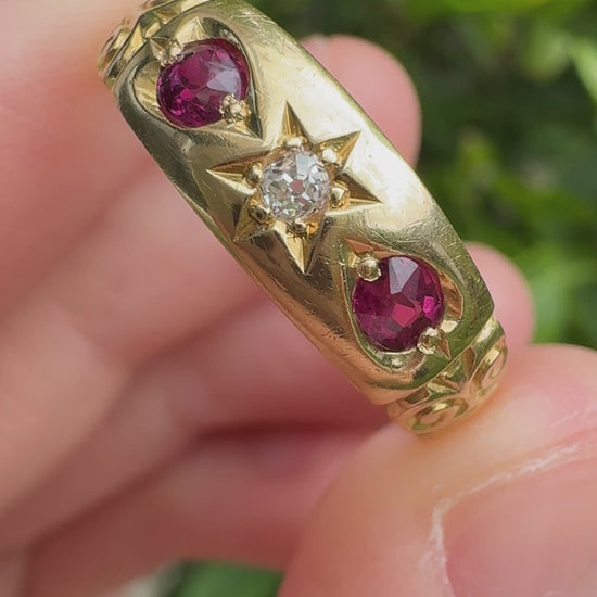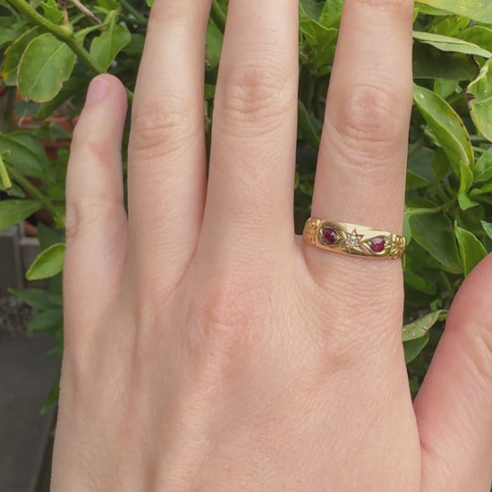 Made in Chester in 1898, during the very last years of the Victorian era, this 18ct gold gypsy ring carries a beautiful warmth and sparkle. Set into the glowing gold are two natural cushion cut rubies totalling 0.3ct, and a central natural 4pt old mine cut diamond (SI1 clarity, G colour) in a stunning deeply carved star setting. The band itself has lots of character as well, with wonderful engraved shoulders. So much personality and beauty in this lovely Victorian piece! Easy to wear, stack and absolutely love.