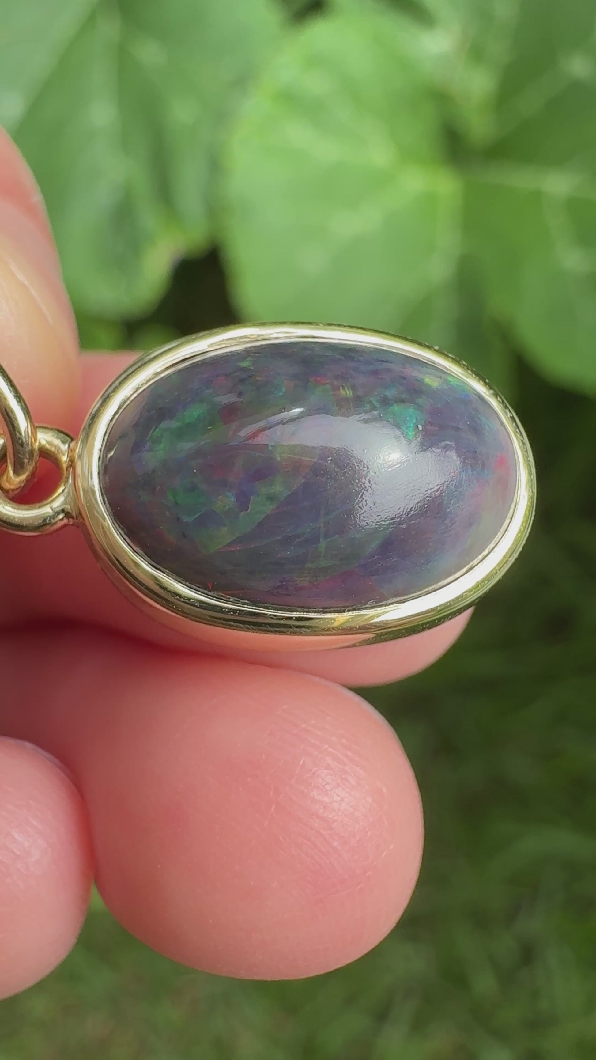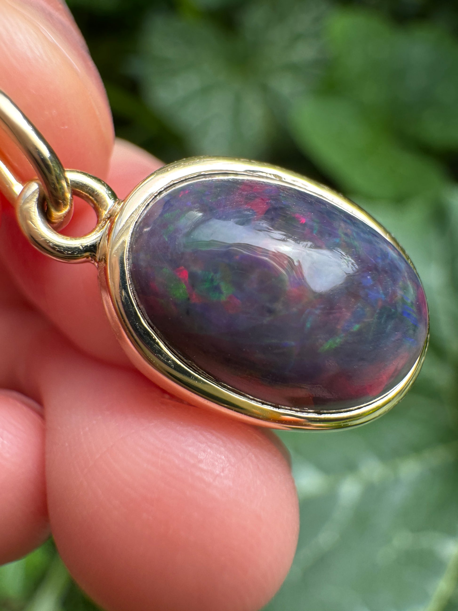 A stunning little piece of nature for your favourite chain. This 3.01ct natural dark opal cabochon pendant was handmade from scratch here in Melbourne, Australia by our amazing jeweller, and set in recycled 9ct gold with a gorgeous handcrafted bezel. Dark and moody at rest, it shows flashes of red, green and blue as the light catches it. Its colours feel almost magical - like a hidden little world within the stone.