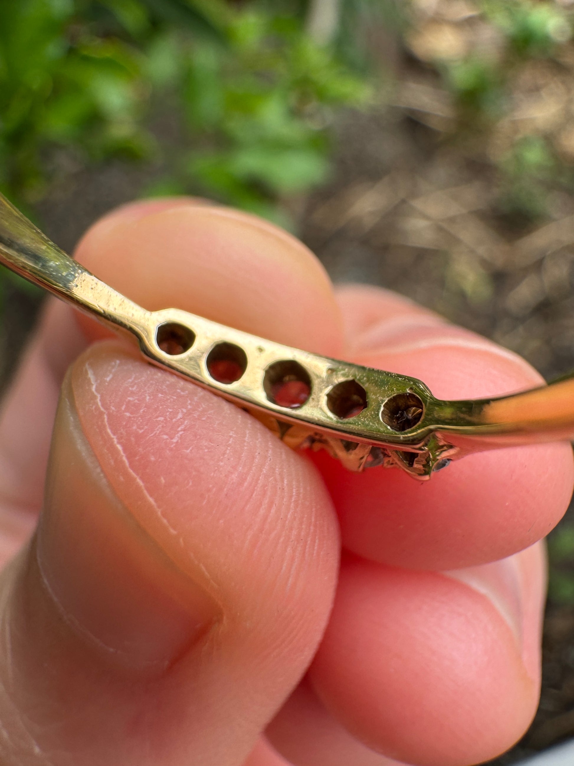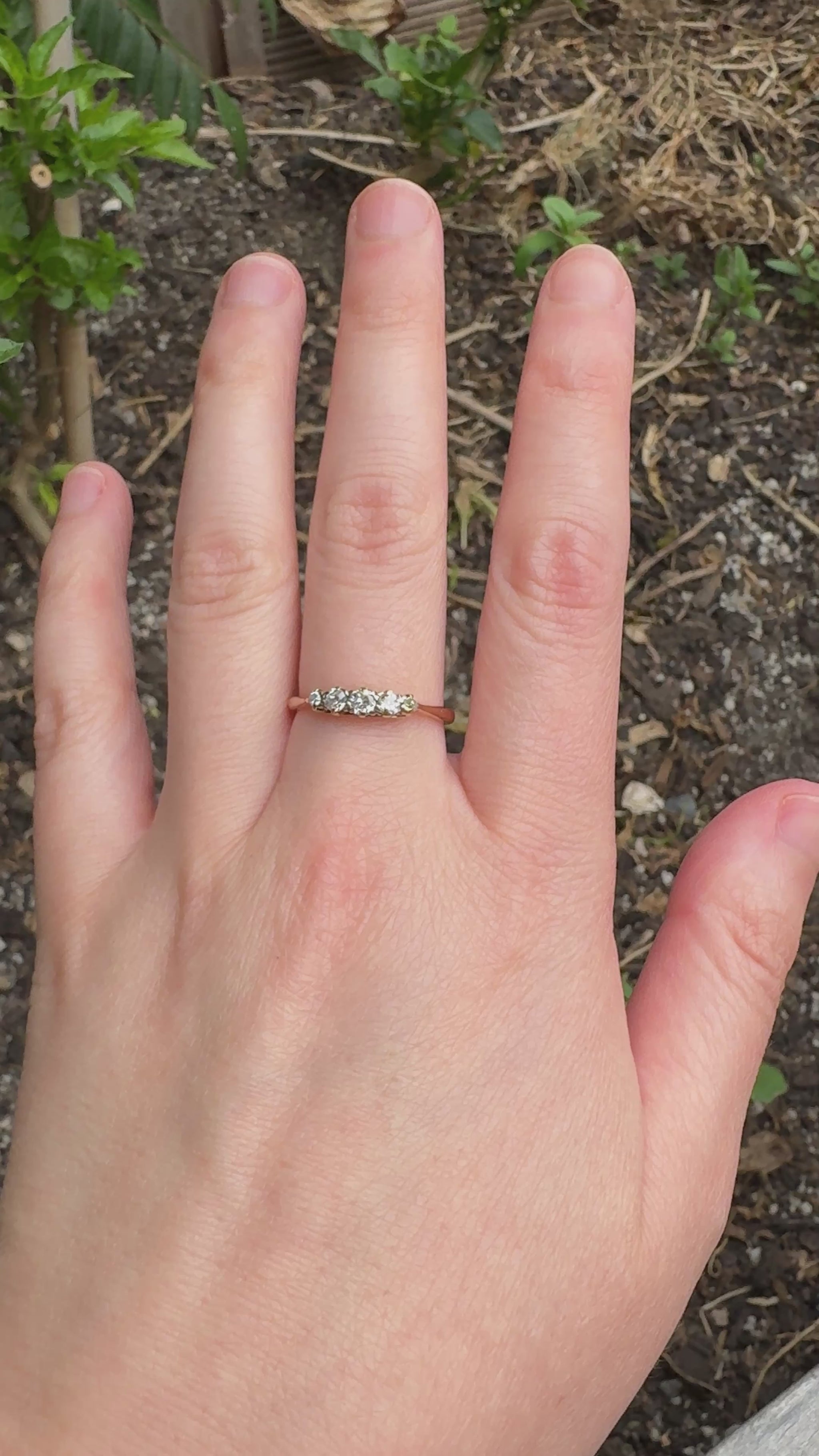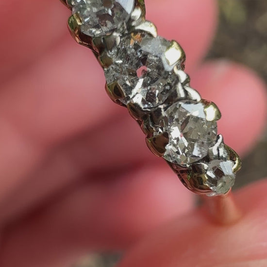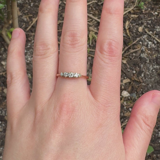 A timeless beauty with irresistible sparkle and charm. This vintage ring features five old mine cut diamonds (natural, SI2-I1 clarity, G-J colour) - each so unique and full of life - set in a classic prong setting that allows the stones to catch the light beautifully from every angle. A romantic and enduring piece that will never go out of style, and is very stackable!