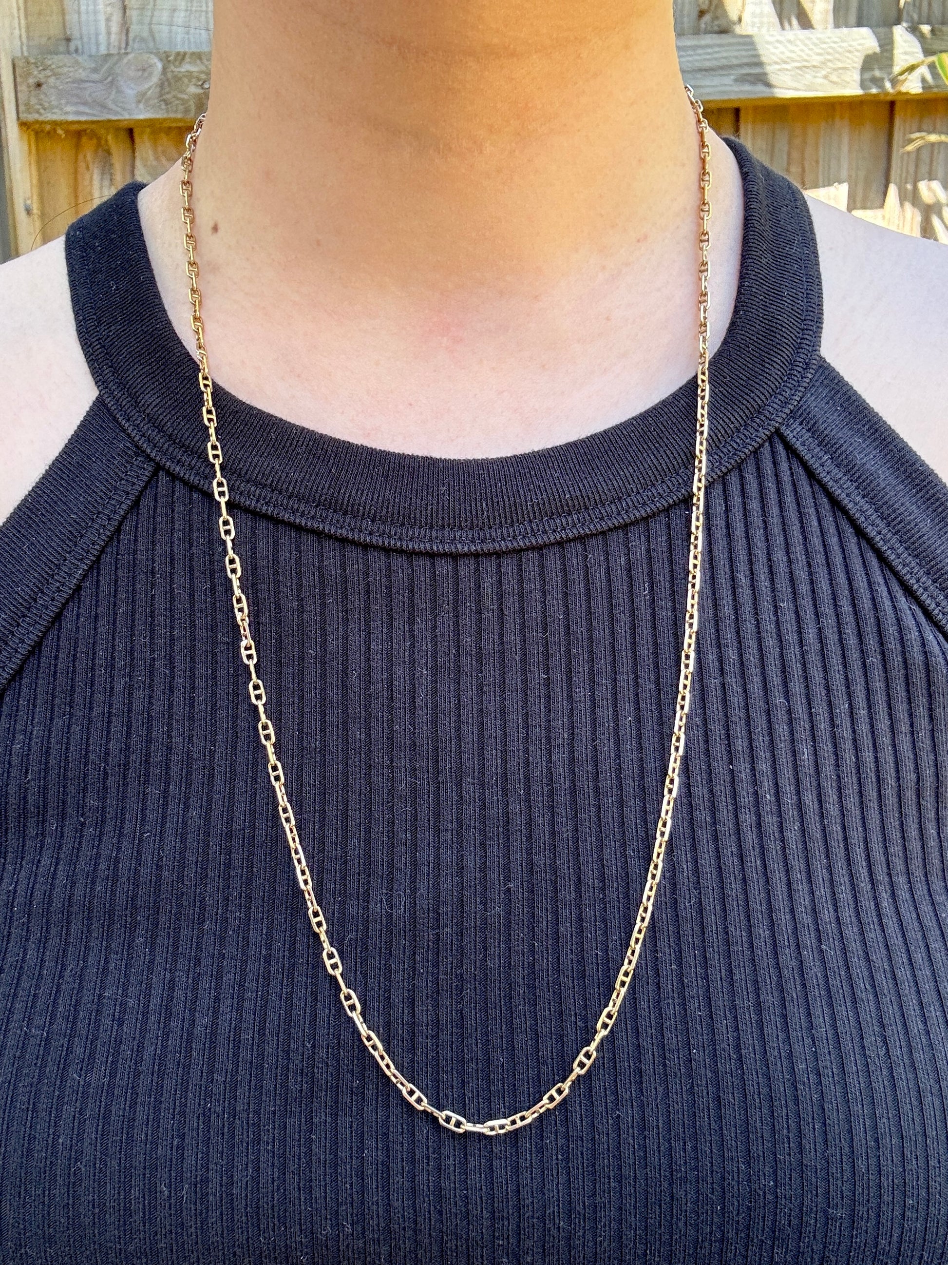 This vintage 9ct gold mariner link chain is a lovely classic, with a warm golden glow and a fantastic look on. It's a very popular link for a reason - it's slinky and shiny, and this one is also a beautiful weight. The perfect everyday piece for layering or wearing on its own that also looks great with your favourite charms/pendants!