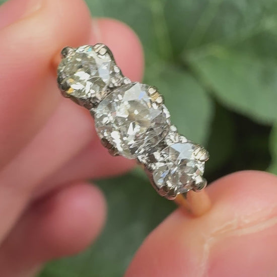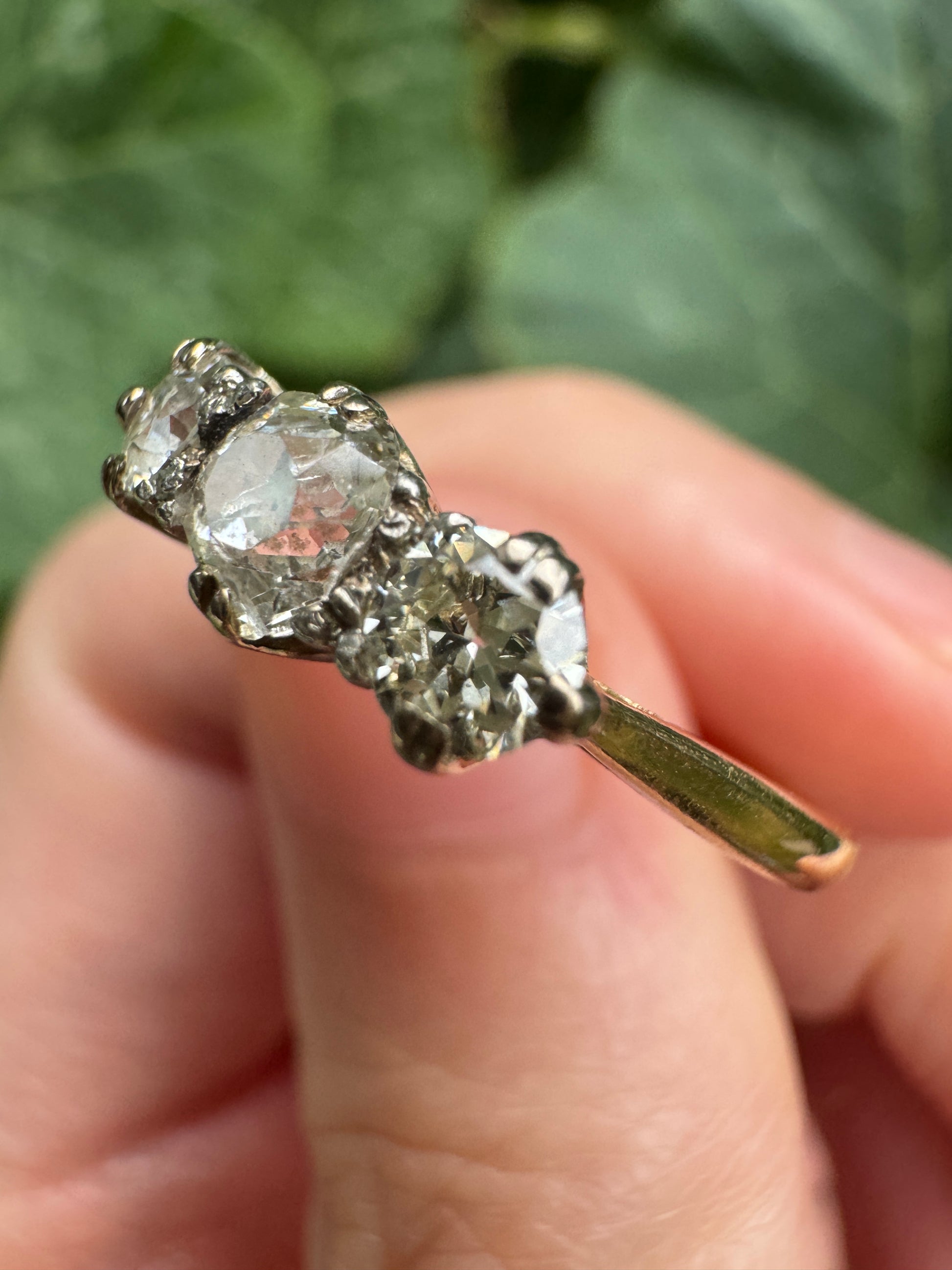 With 0.86ct total diamond weight across the three stones, it has fantastic presence and finger coverage, while still feeling easy to wear day to day. The combination of old mine cut and old European cut diamonds brings that 'can’t stop looking' quality: bold flashes, soft facets, and a sparkle that suits yellow gold perfectly.