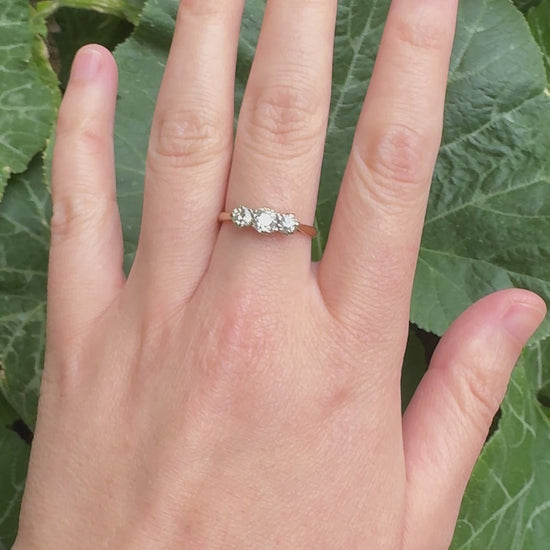 Vintage English 18ct yellow gold three stone 0.86ct TCW old mine cut diamond ring