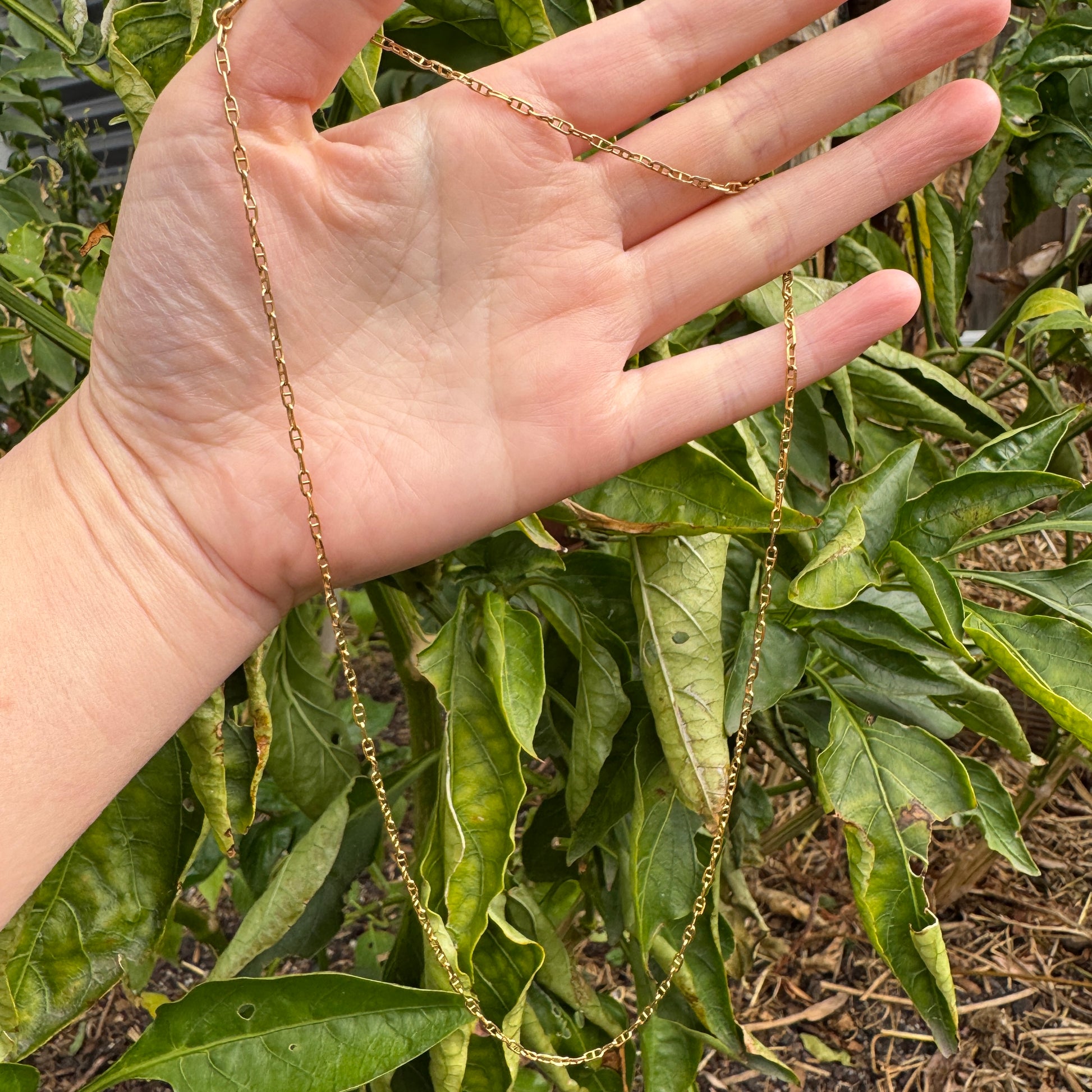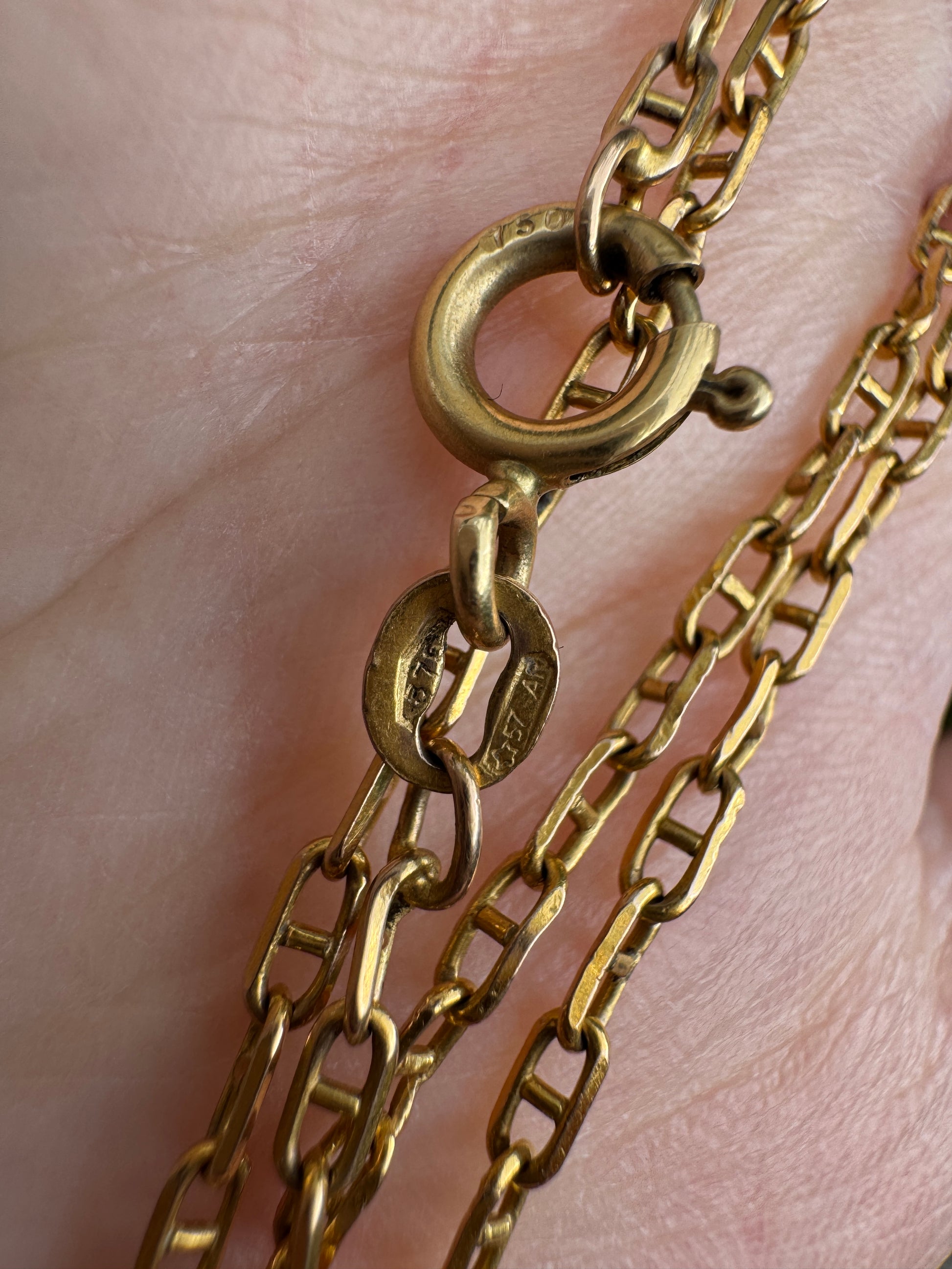 This vintage 9ct gold mariner link chain is a lovely classic, with a warm golden glow and a gorgeous look on. At some point in its life, the clasp was replaced with an 18ct gold one - a small detail that feels like a little bonus! The colour matches beautifully with the rest of the chain, so it does not stand out. The perfect everyday piece for layering or wearing on its own, that also looks great with your favourite charms/pendants!